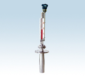 該產品由本體(由上、下導管組成)、翻板箱(由紅、白雙色磁性小翻板組成)、浮子(由磁體、頂桿、浮筒 組成)、以及液位變送器等組成,其結構如圖所示。工作原理為:容器內的浮筒(按不同介質和壓力針對研制), 在下導管中隨液面高度的變化而上下浮動并通過頂桿使磁體在上導管內上下移動,促使本體外的翻板翻動 并顯示紅、白顏色來指示液面高度,同時液位變送器將液位信號傳送至控制中心進行液位指示和控制,也 可通過計算機進行集中監(jiān)控。